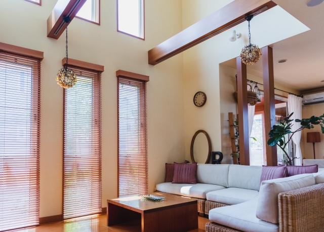 夏には温まった空気が部屋の上に溜まるので、吹き抜けや勾配天井は熱い空気の溜まる空間が大きくなるのと、上部に窓を取って積極的に熱い空気を抜く事ができるので、とても有効で過ごし易いリビングになります。